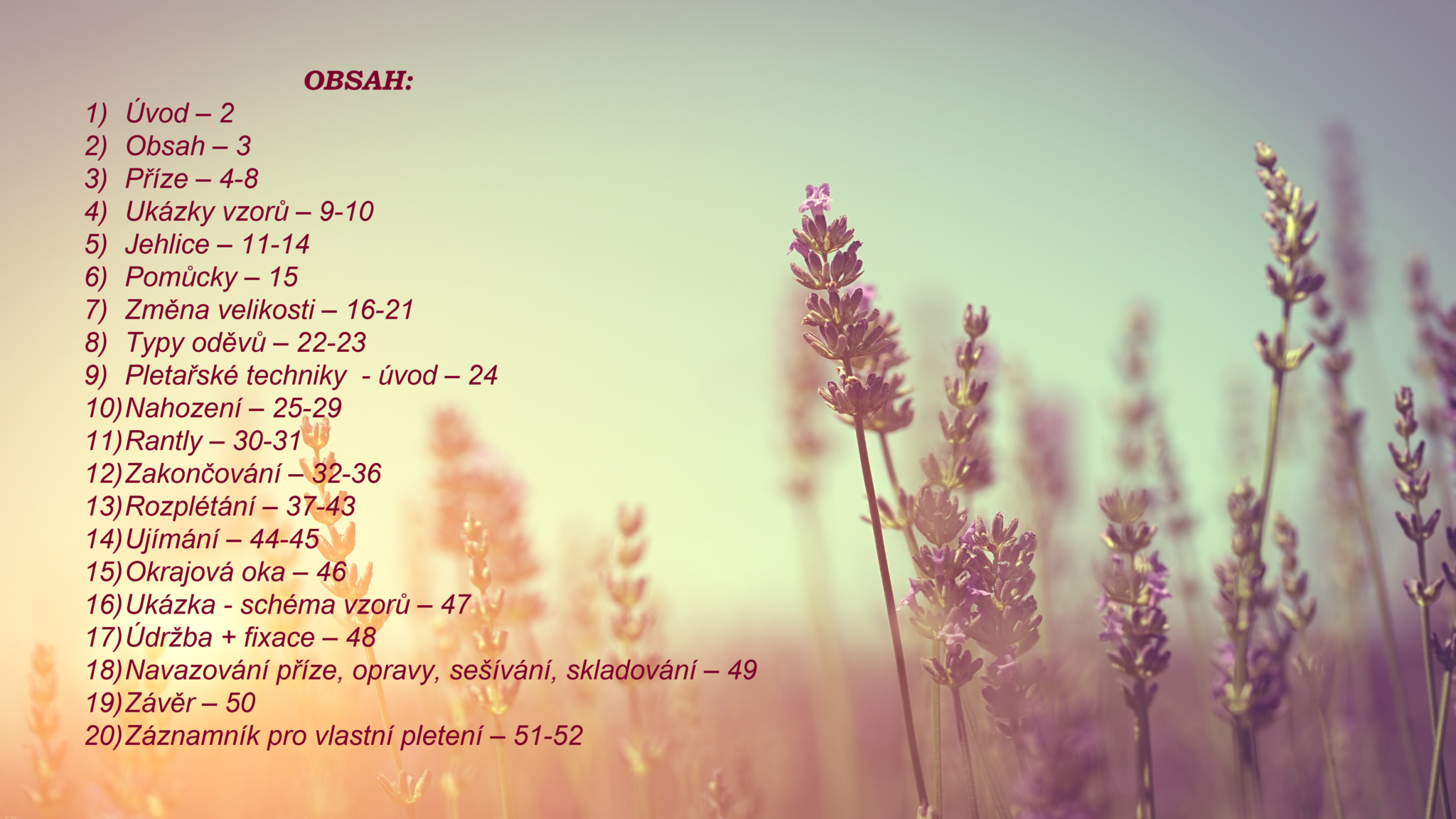 Ucelený a praktický přehled základních informací o přízích (typy, vlastnosti, složení, vhodné upotřebení, péče o pleteninu), jehlicích (druhy, materiály, vhodnost dle typu oděvu), typech vzorů (ažurové, norské, aranské, žakárové…, vliv použité příze a jehlic na vzor), velikostech (jak si vypočítat či přepočítat vlastní velikost, co je vzorek), střizích oděvů, typech rukávů (vsazované, rovné, raglán), technik pletení (více typů nahazování, uzavírání + ujímání, rozplétání, sešívání), schémat vzorů a další informace, rady a tipy.