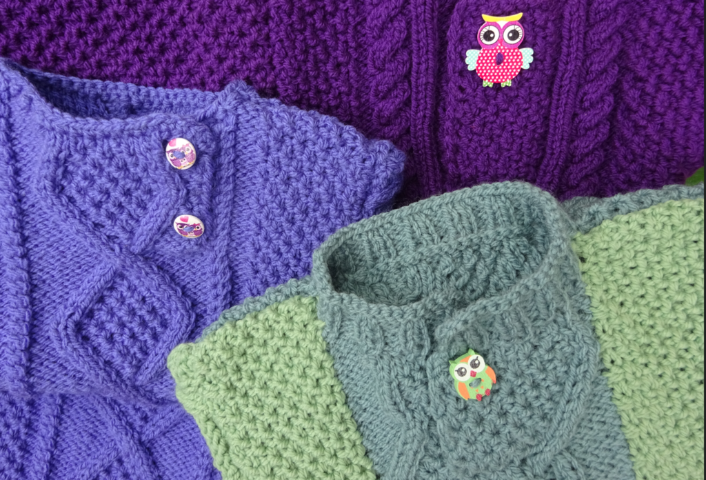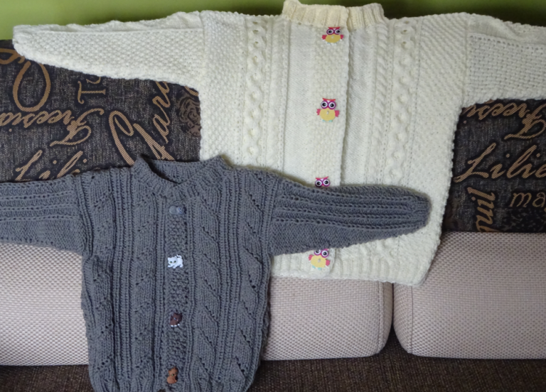 - Typ pleteniny: jde o dětský svetřík či pánský silný svetr? Jemná bavlna či příze s vyšším obsahem vlny? Ažurový vzdušný vzor či plastický aranský vzor na silných jehlicích? Podle designu a materiálu volíme vhodný typ knoflíků, tvar (kulaté, hranaté, olivky, rohy, designové, tvar zvířátek, ovoce, písmenek, mořské motivy…), velikost (průměr), barvu, materiál (dřevo, kokos, korek, plast, kov, sklo, kůže, perleť…). A nikde není psáno (a i kdyby bylo), že nemůžete na jednom svetru zkombinovat třeba 2 typy knoflíků (nebo i více, např. u dětského veselého svetříku použijeme více druhů zvířátek). Je tu ale nutno více přemýšlet…