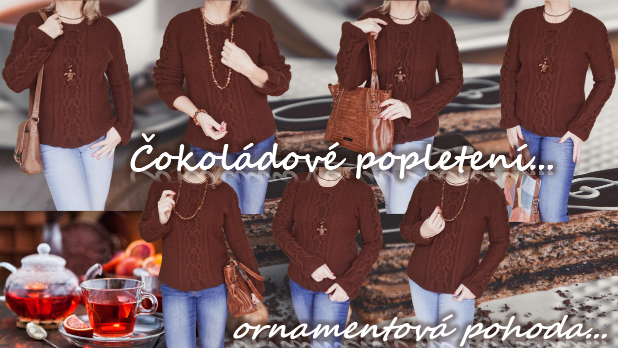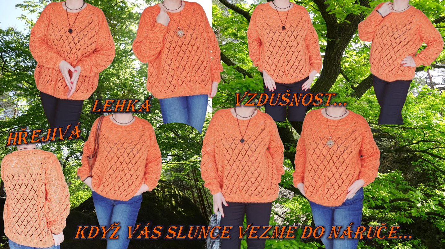 Oranžovo-hnědá varianta pohodlného hřejivého pulovru. Jemné trojité křížení v pase a na předloktí zajišťuje přiléhavost oděvu a opticky tvaruje postavu. Zvolené vzory a střih (včetně mírně vsazeného rukávu) pomáhají použité přízi hřát (a zároveň dýchat) po celém těle. Proto je vhodný spíše na ven, příp. do chladnějšího interiéru.