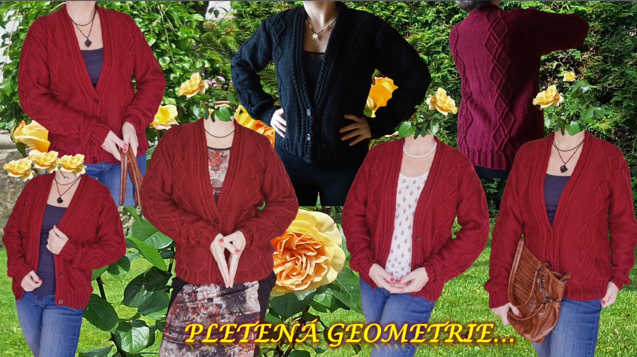 Elegantní provedení a pohodlný střih – to je kardigan, vhodný k mnoha kombinacím. Přední okraje zpevňuje rýžový vzor a copánek, eleganci zajišťují ornamenty, které se na zadním díle doslova předhánějí. Čtverečkované vsazované rukávy jsou zakončené vroubkovým vzorem obepínajícím zápěstí. Vroubky jsou i kolem výstřihu. Půvabné bude jakékoliv barevné provedení. Volba knoflíku také velmi ovlivní celkový dojem.