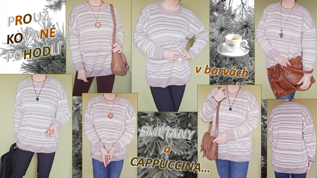 Rovný střih, kulatý výstřih, příjemný materiál, pohodlná délka rukávů i pulovru. Nepravidelně se střídající proužky o různé šířce hlídají na okrajích širší pruhy cappuccinového odstínu, kolem výstřihu pak rantl o 3D-efektu (kombinující lícový žerzej a pružný vzor).